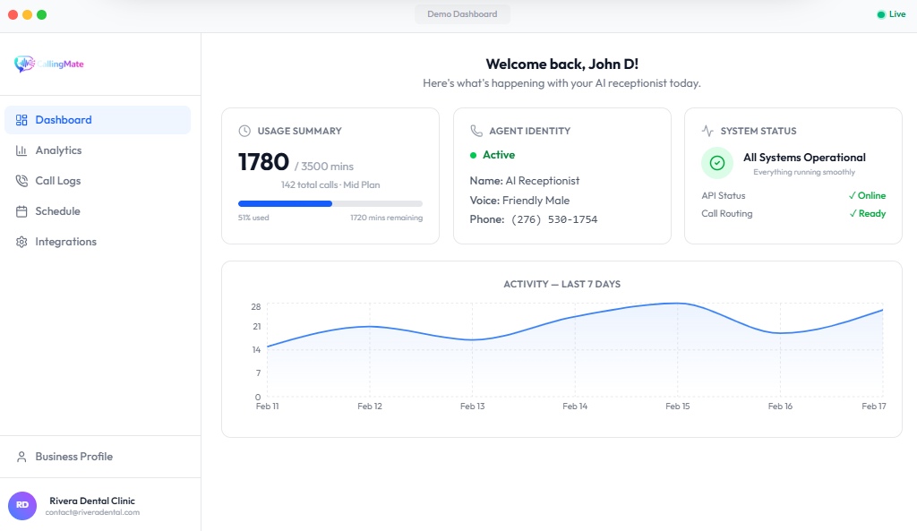 "CallingMate helped us answer calls after hours and convert inquiries into booked appointments automatically. It's like having a receptionist who never sleeps."